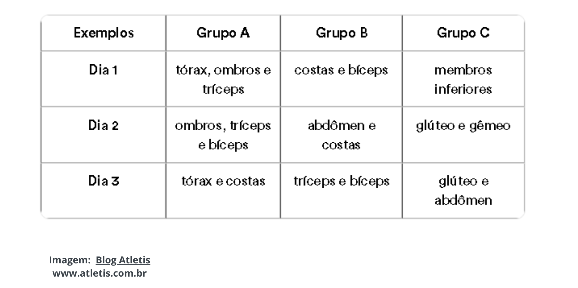 Para que não haja dúvidas, trouxemos uma tabela com três exemplos distintos de divisão muscular. Veja só!